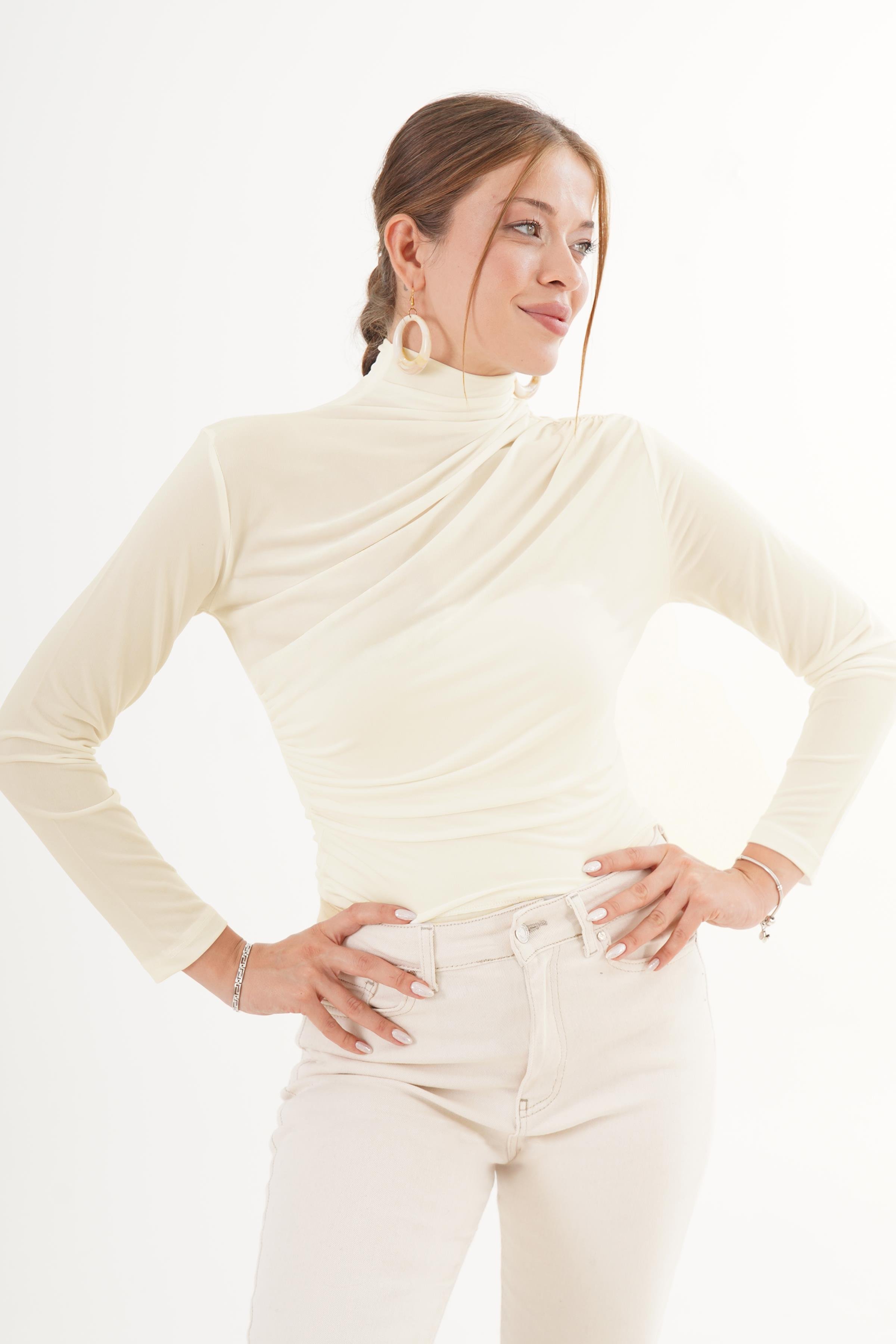 Büzgü Detaylı Dik Yaka Taş Sandy Bluz
