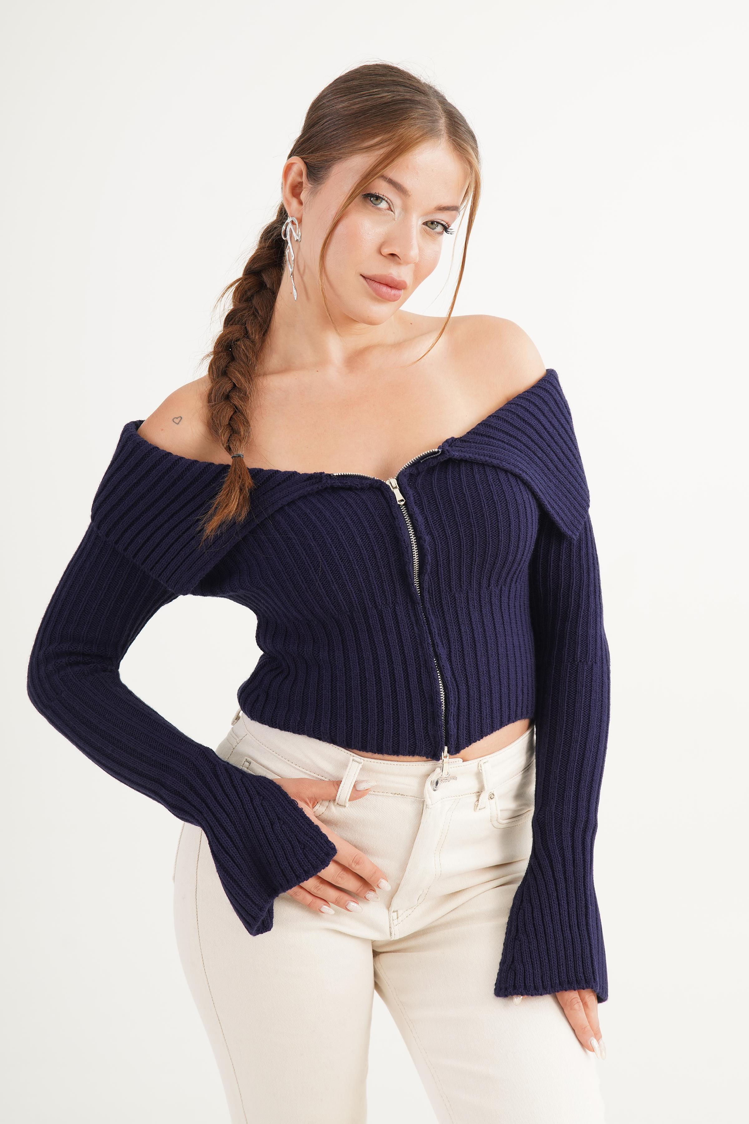Çift Fermuarlı Modonna Yaka Fitilli Lacivert Triko Hırka