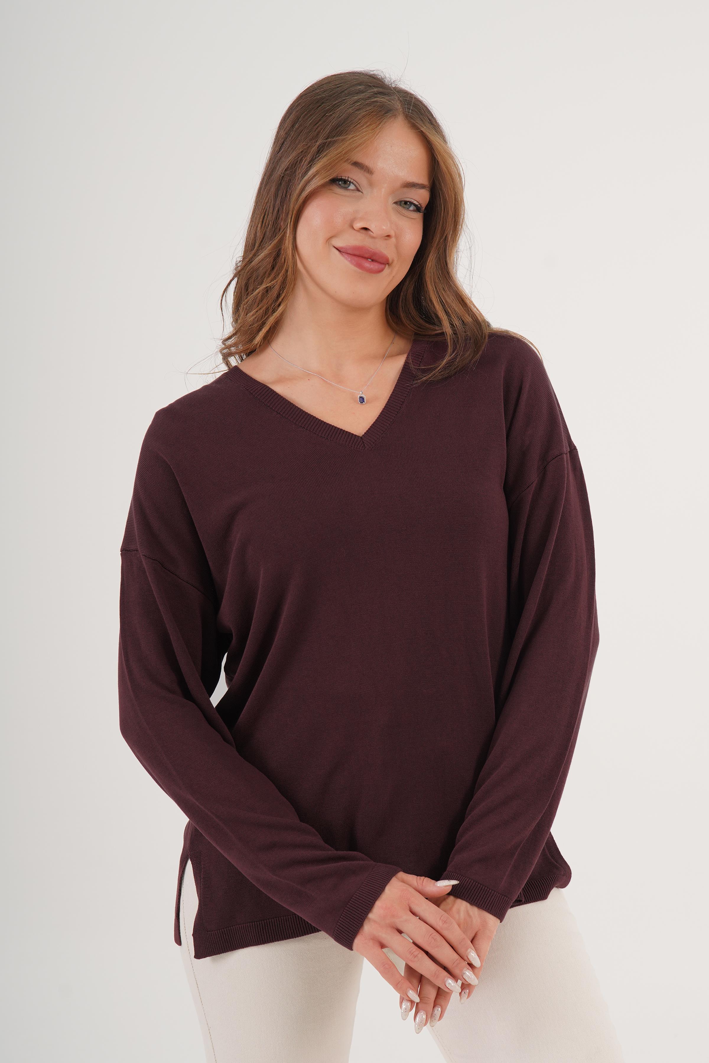 V Yaka Yan Yırtmaçlı İnce Kahve Triko Kazak