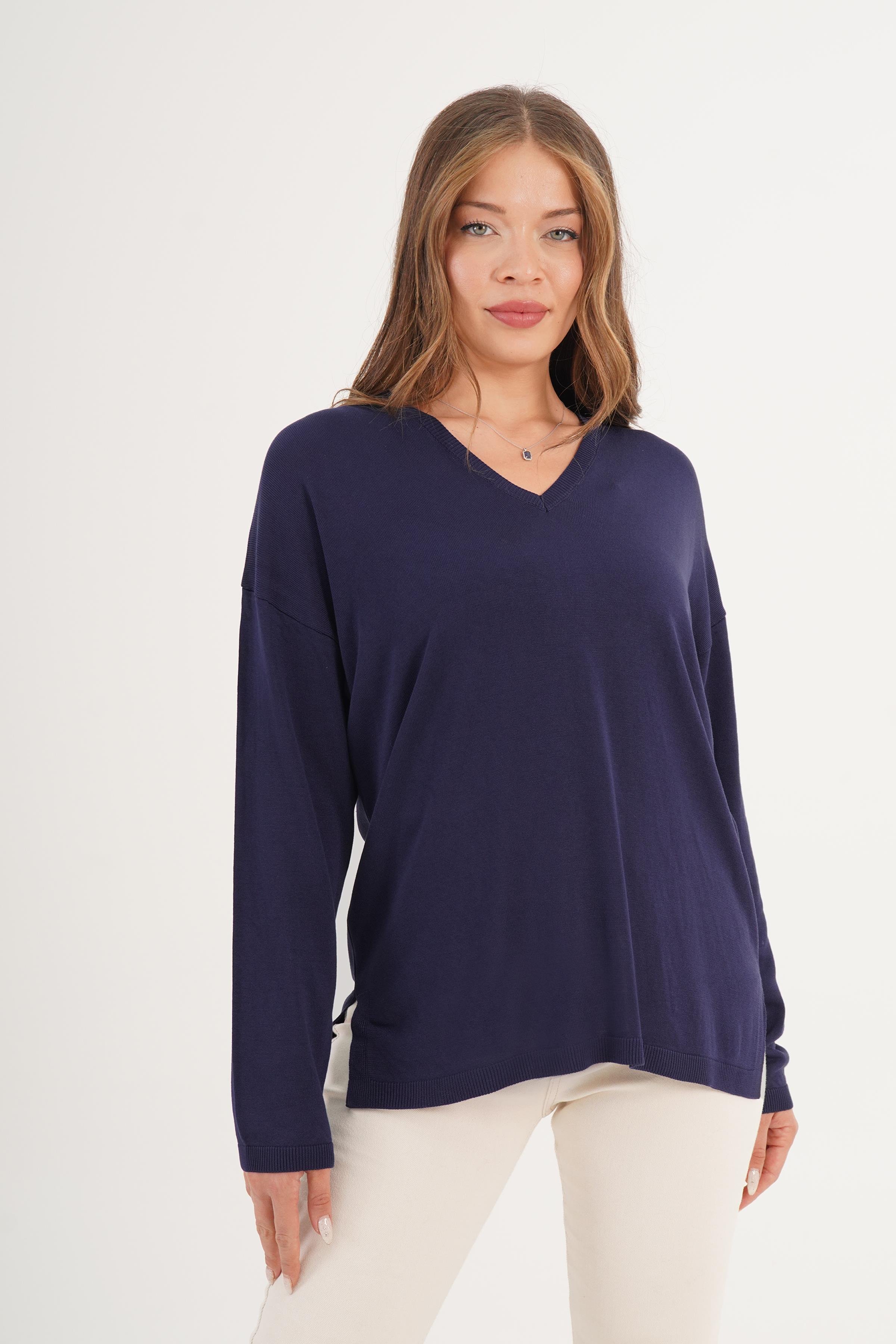 V Yaka Yan Yırtmaçlı İnce Lacivert Triko Kazak (2001-6630)