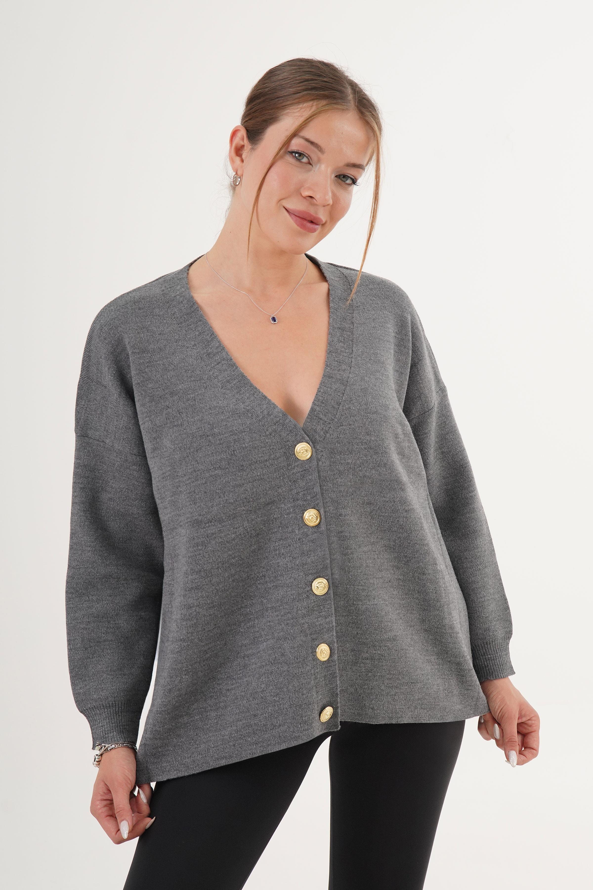 Şıklığı detaylarda saklı! Gold Düğme Detaylı V Yaka Triko Hırka, 2025-2026 kış sezonunun zarif ve modern favorilerinden. Yumuşacık triko dokusu ve özenle tasarlanmış altın düğme detaylarıyla hem ofis stilinde hem günlük kombinlerde fark yaratır. Jean, etek veya elbiselerle tamamlayarak kış stiline sofistike bir dokunuş katabilirsin. Her kombinde stilini ön plana çıkaran bir parça!